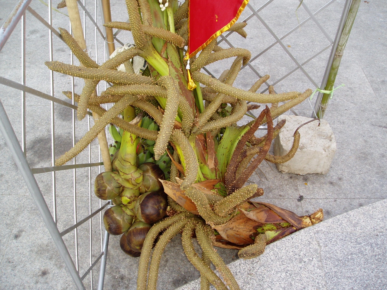 何しろ・・この長いビヨーンとした部分が花だなんて??言われなければ分かりませんよね・・お供えにしかも実と花の部分を丁度持ち合わせている木を調達出来るんですから・・凄いですね・・中々見応えあります。市場で売られている物には流石に花が付いているものはありません。珍しい物です。 -