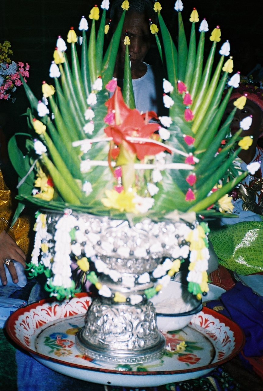 色々な形があるのだがこれは出家をするときに使う白いサイシンを巻くもので、結婚式や、家のタンブーンや行事など沢山の用途に別れ作成されている。バナナの葉を起用に細工して作るので、本当に技術のある人の作品は最高に素晴らしい!!でもそれを拝む事は中々難しい・・