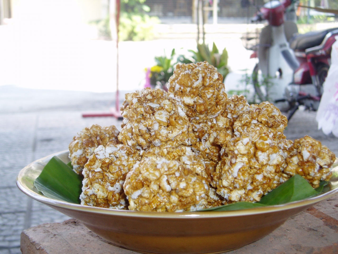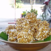ご飯を水に一晩浸し-大きな鍋でポンポンと弾けるまで炒めて-サトウキビの砂糖液をまぶして丸めた物・・簡単そうで以外にコツがいる・・作りかけのサトウキビの液が美味しくて・・何でも付けて食べたら・・村中で笑いものになっていた。