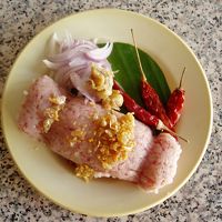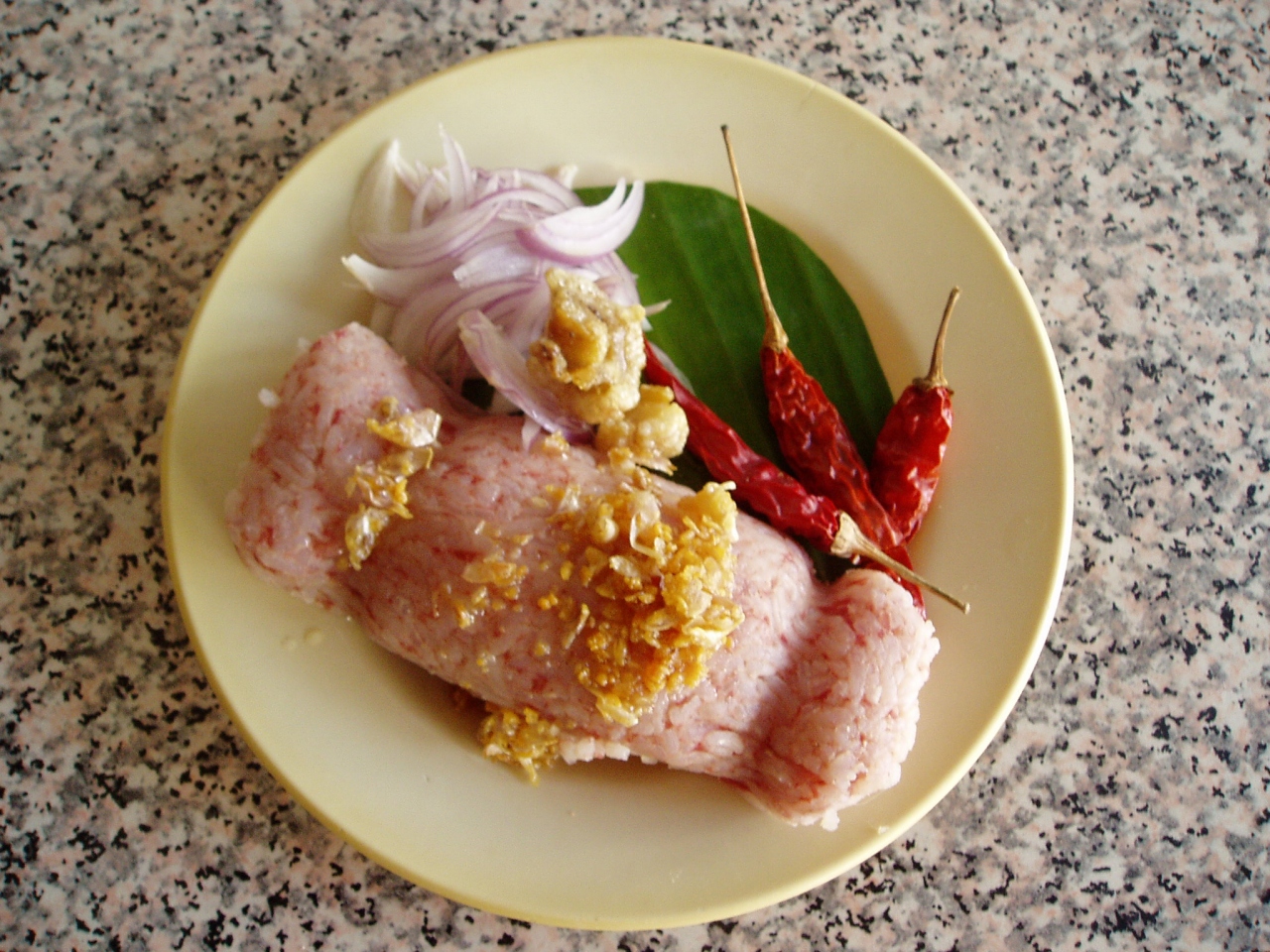 米を普通に炊き-豚の赤身のひき肉を混ぜ―塩などの調味を加えて―バナナの葉で包み―更に茹でる。んんんん・・・ 簡単そうなのに包むのが大変コツがいる。更には炊き上がった米に豚を発酵させ酸味が出たものとアカ玉葱とカティアムを入れて同じようにしたものと2種類ある。