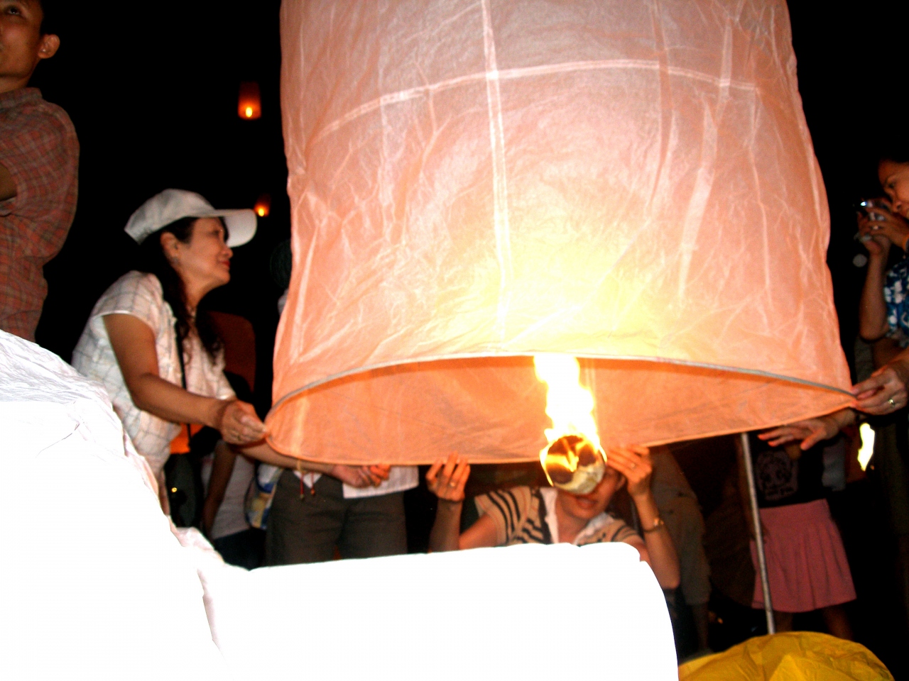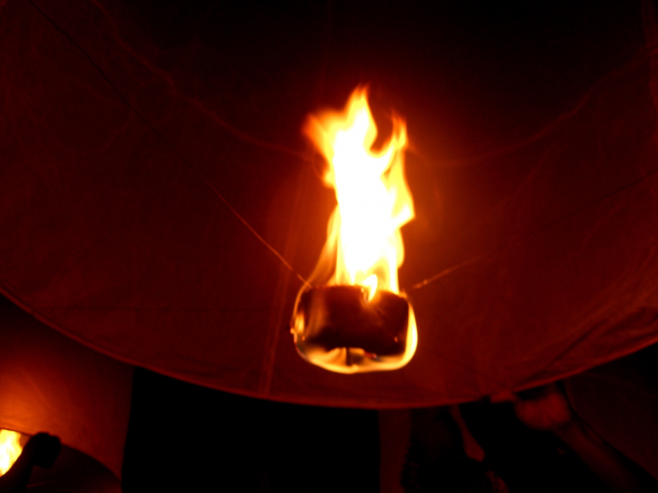 近くでコンファイをあげている人と出会ったらば・・その人があげるのを待つくらいの余裕であげましょう・・もし側の人が花火などを点かさせるしくみのコンファイをあげていた場合にその花火が頭の上に落ち髪の毛が焼けたとか目に入り目クラになるなどの事例が毎年報告されるからです・・側とはいえ大丈夫だと言う保証はありません・・それはオイルでガスをもやすのですから引火しやすいということです。