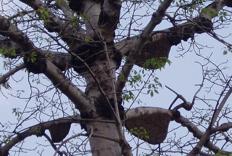 見た目にはトリノ巣かと思いましたが、ヨーク見ていると時々凄い黒い塊がそこから落ちるんです、落ちても直ぐ飛び散るように見えたので・・其れが蜂だとは分りませんでした。成る程・・蜂の巣ねえ・・・なら分ると思いましたが、遠めで見てもかなりの大きさしかも左右上下合わせて4個も作られているではありませんか・・おじいさん曰くあの蜂の巣はこれから多分膨張してくっ下ろうから、相当な大きさになるな・・今でさえ扇風機の頭くらいの大きさがですよ?4つくっついたらどんな大きさなんでしょうね・・・想像出来ないものがありました、ちなみにあのくらいの蜂の巣だとかなりの子供を中に抱えているので高いんだそうです、1個800Bから2000Bくらいで取引されるそうです、それは自然世界で生きている蜂と言うこともあるそうで、栄養素が満杯に詰まっているからねと言う事です。確かに・・・ -