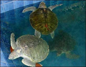 体に沢山ついた傷が痛いたしいが、元気に泳ぐウミガメ達。