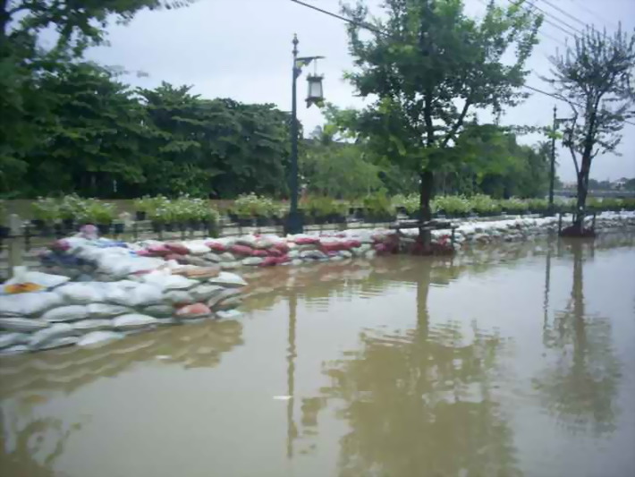この砂袋が積み上げられてから1週間そして危険といわれてから2日目既に危険解除は言われても相変わらず雨量で急激の増水したメナーム川のスピードはいつもよりスピードを上げて流れているのでその砂袋が何時押し流されるか?が問題なのだ・・ただその水の勢いが反動で砂袋をばねにして先へと流れてくれれば洪水は避けられる・・ただし・・既にでてしまってた水はどうしてもその部分の堤防が低いためどうしようもない・・そこ全体を高くすることは既に不可能な状態にあるからだ・・そのため毎年その場所から水が出ている・・