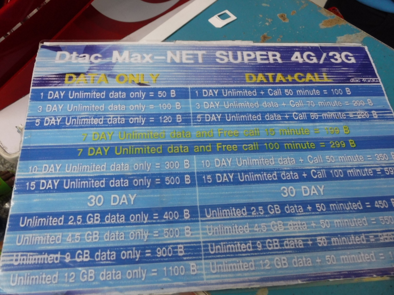 通信速度: まあまあ速い つながりやすさ: まったく問題なくつながる 手続きレベル: 特に難しくはない また使いたい: はいプーケット国際空港の荷物受取所の一角にテーブルを置いて、True move のプロペイドSIMを販売しています。7日間1GB&100TBの通話料で300TB。その場でTop up(set up)もしてくれます。