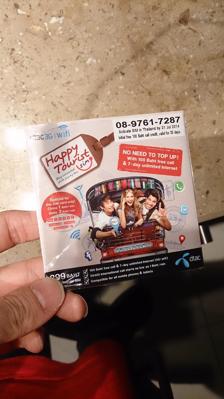 タイにはAIS、TRUE、DTACの3つの大手携帯キャリアがありますが旅行者にとって最も気軽に使えるのがDTACのHappyTouristSim。スワンナプーム空港の出口近くのショップで販売していて299Bです。7日間1Gまで3G回線のインターネットを使用でき、100B分の通話もできます。
