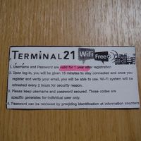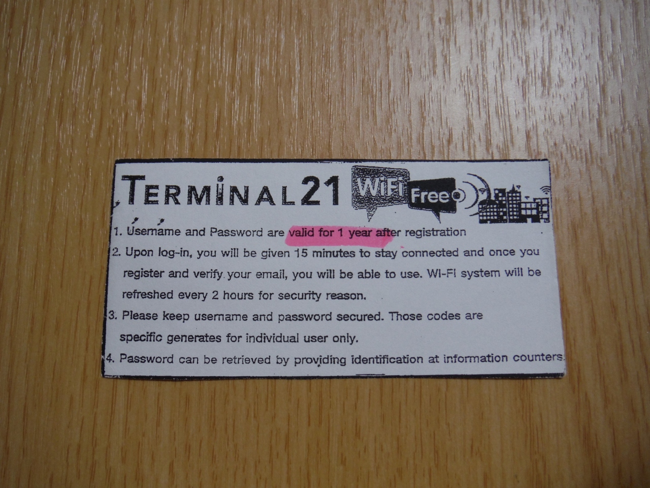 Informaionカウンターに行き、Wi-Fiを使いたいと言ってパスポートを見せると、IDとパスワードを教えてもらえます。ブラウザーを立ち上げるとTerminal21のIDとパスワードを入力する画面が表示され、先ほどもらったものを入力すると、次にメールアドレスを入力する画面が現れます。それにも入力すると、Wi-Fiが連続2時間使えるようになります。2時間経過後も同じことを繰り返せば、実質何時間でも無料でWi-Fiを使えます。