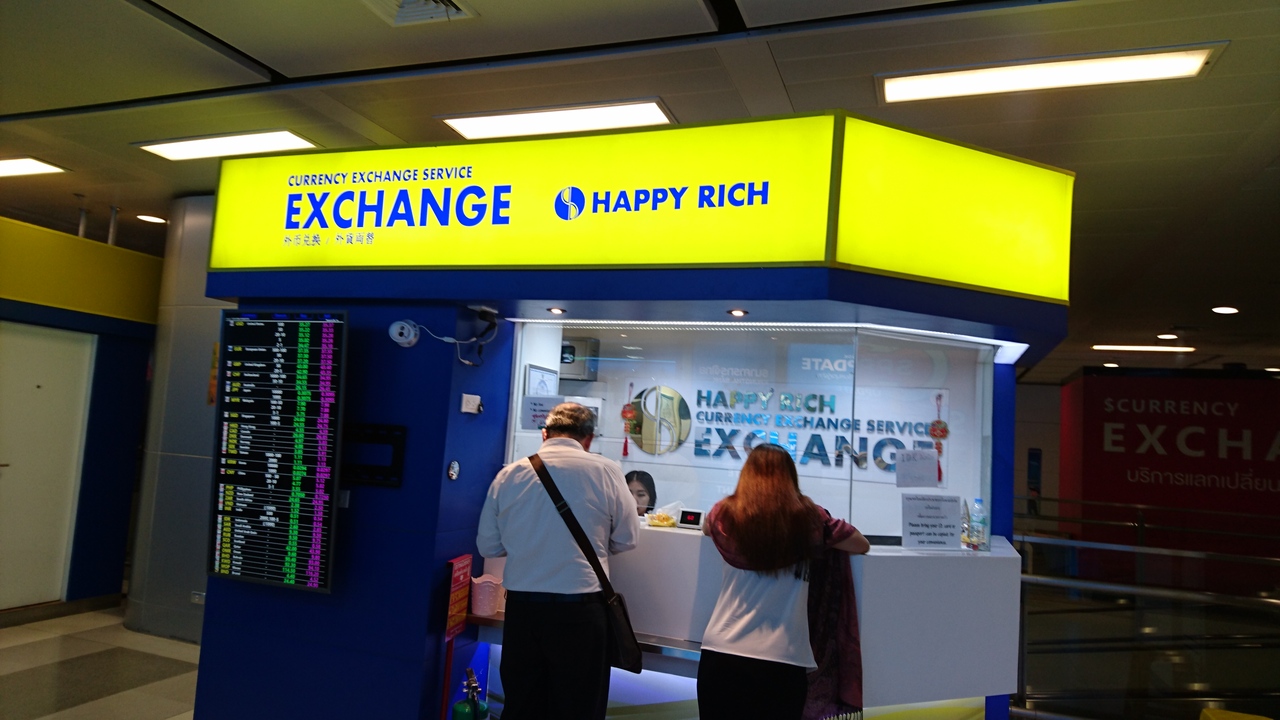 もし電車で市内に出るなら、エアポートリンク駅構内の両替所をオススメします。空港内にある銀行系の両替所よりもレートがいいです。10000円(3075バーツ)を両替して、100バーツ以上違いました。