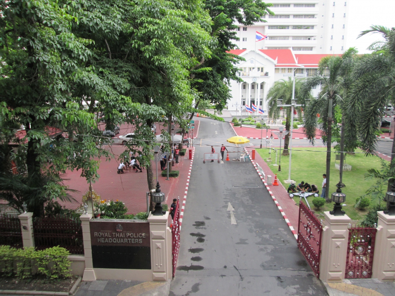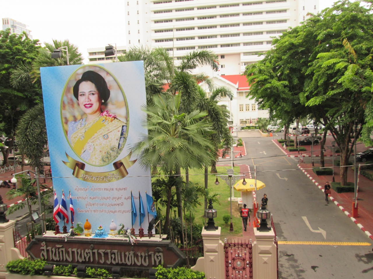 タイ国内のいたるところで皇族の写真を見かけます。プーミポン現国王様、シリキット王妃様、シリントーン王女様などの写真がいたるところに飾られています。写真はバンコク市内にある警察関係の施設の入口で、大きな写真がありました。
