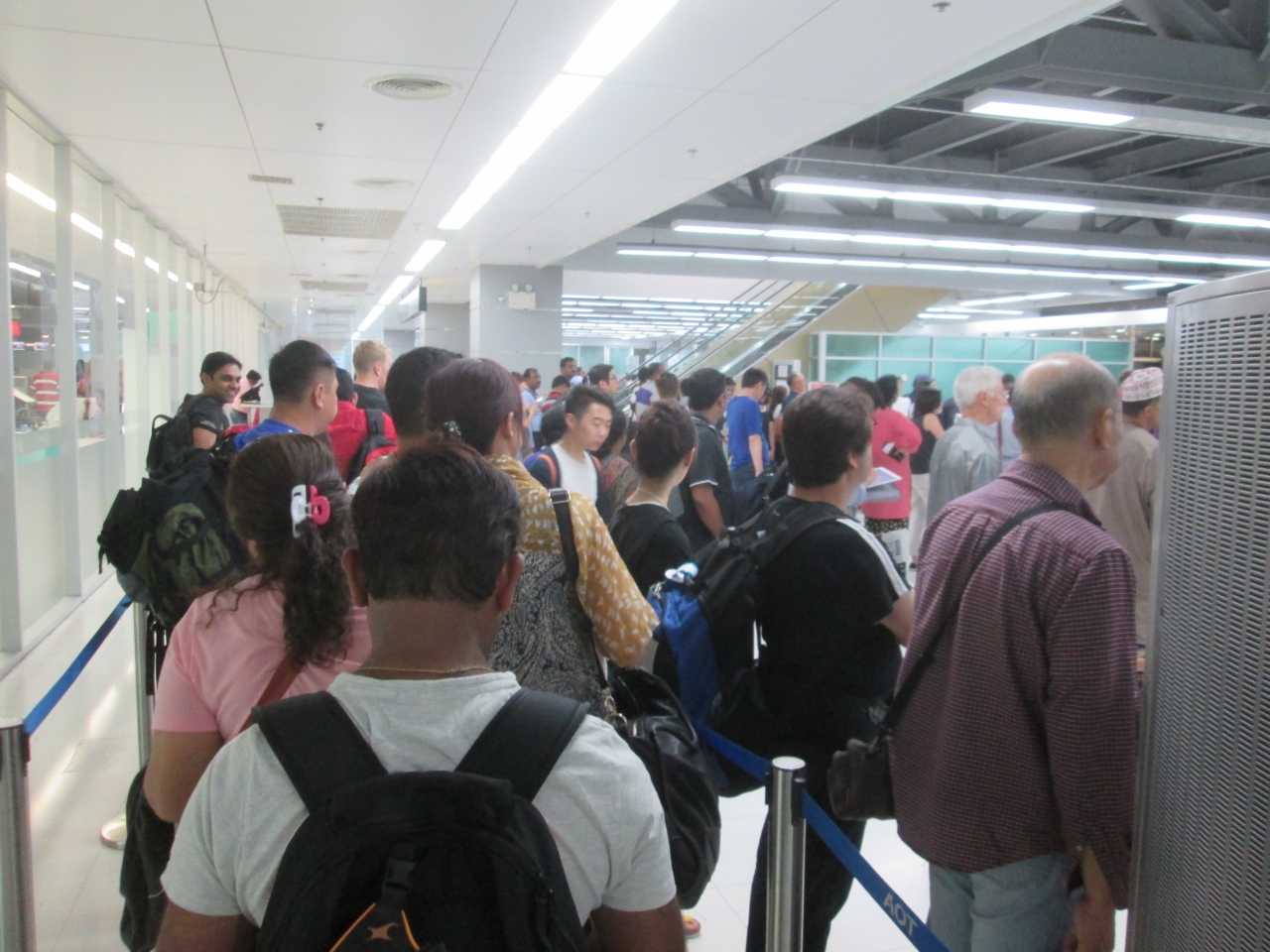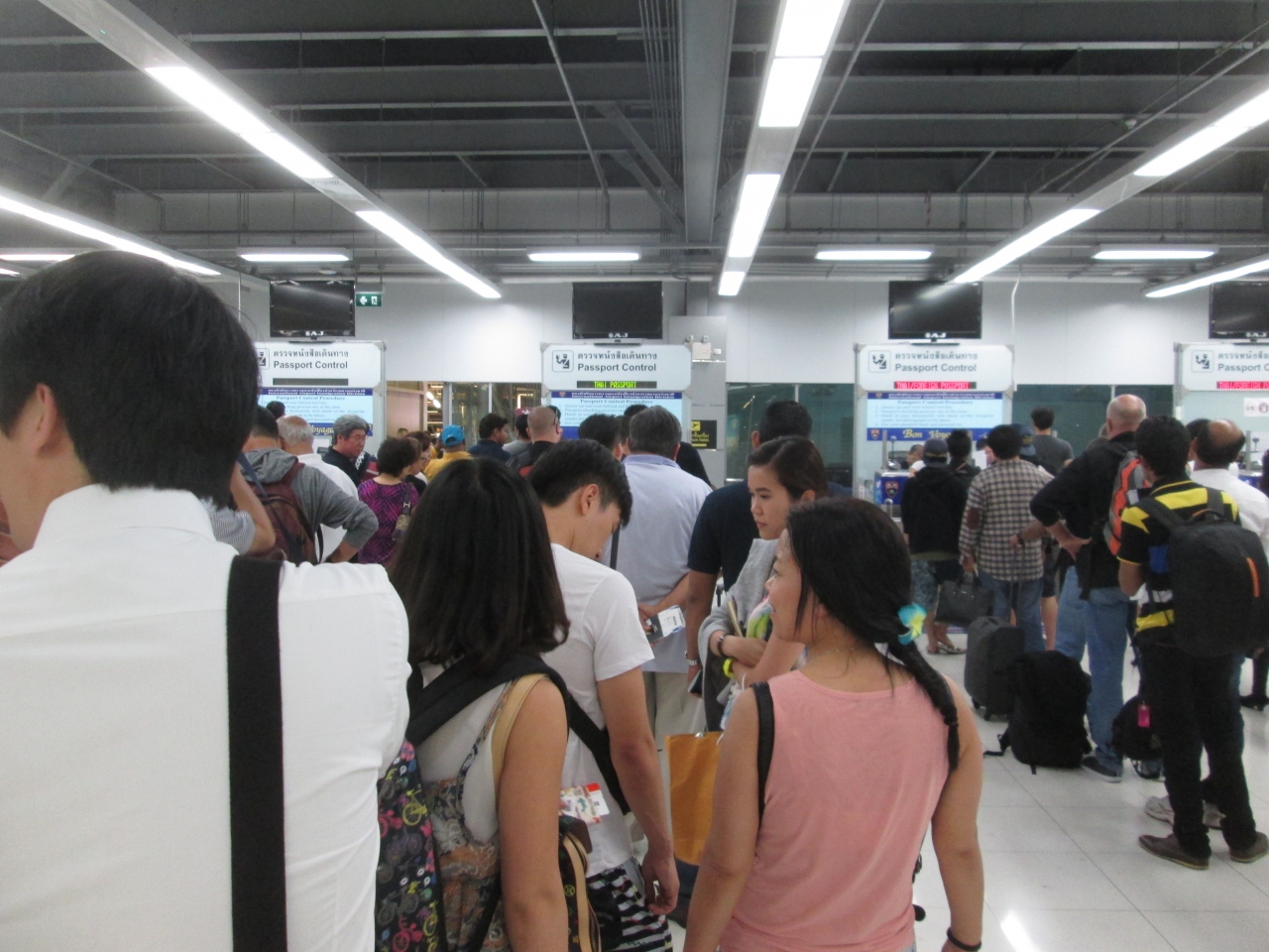 6/8、JAL便でスワンナプーム空港から出国しました。空港には早く到着したもののタイミングが悪く出国審査場が長蛇の列でした。最近は中国人、韓国人だけでなくインド人の姿を多く見かけます。プレミアムレーンを除き、一般の出国審査はここだけですので、ここを通過するために余裕を持って行動することが必要です。
