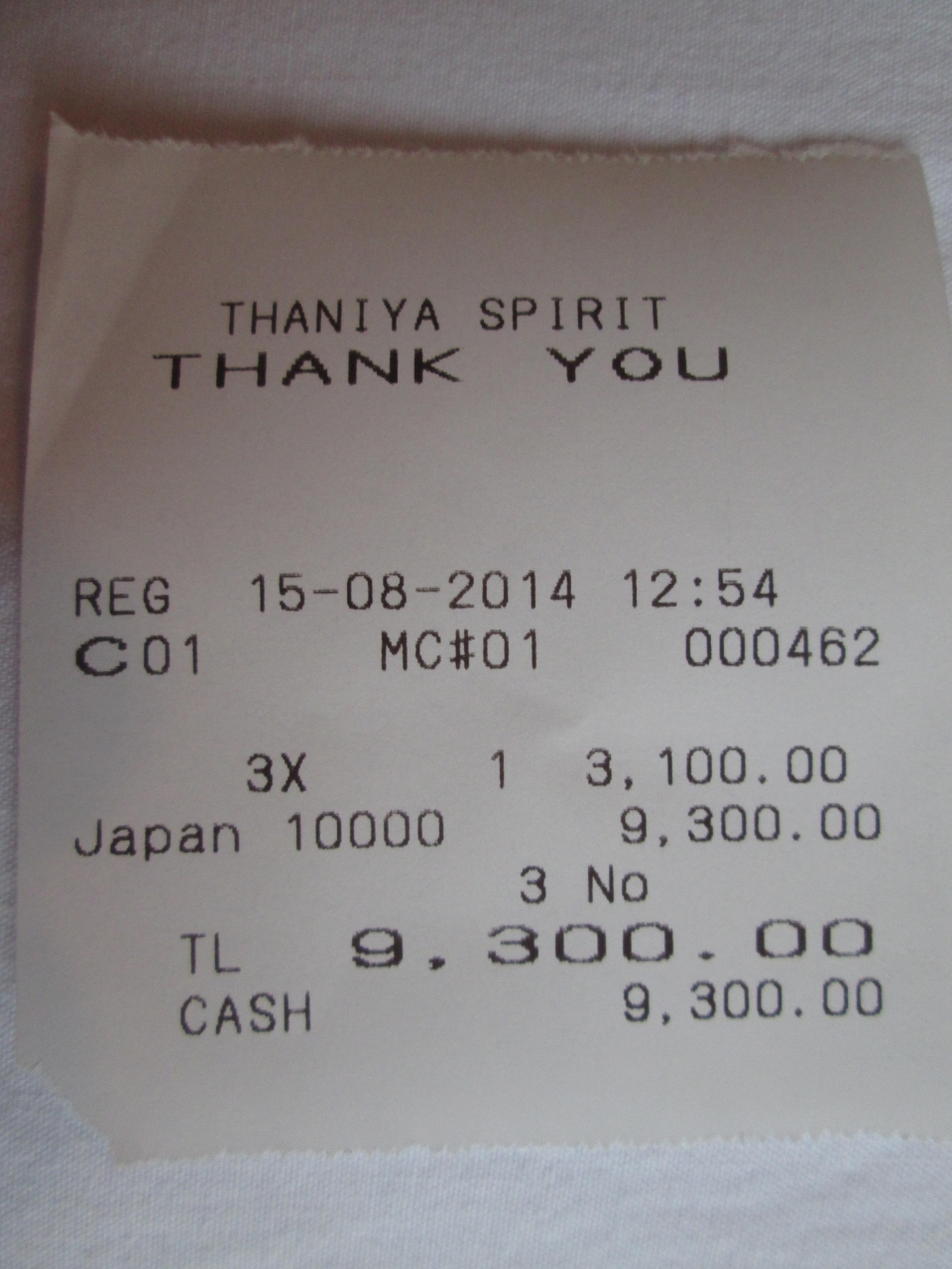 8/15(金)、タニヤ通りにあるレートの良い両替所「リカーショップ」で両替しました。1万円に対して3100バーツというレートで円安の影響か悪いレートになっていました。念のため同じ通りにあるむらさき薬局を確認しても同じレートでした。以前のレートの良い時代に戻って欲しいものです。