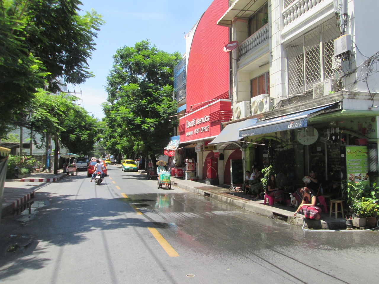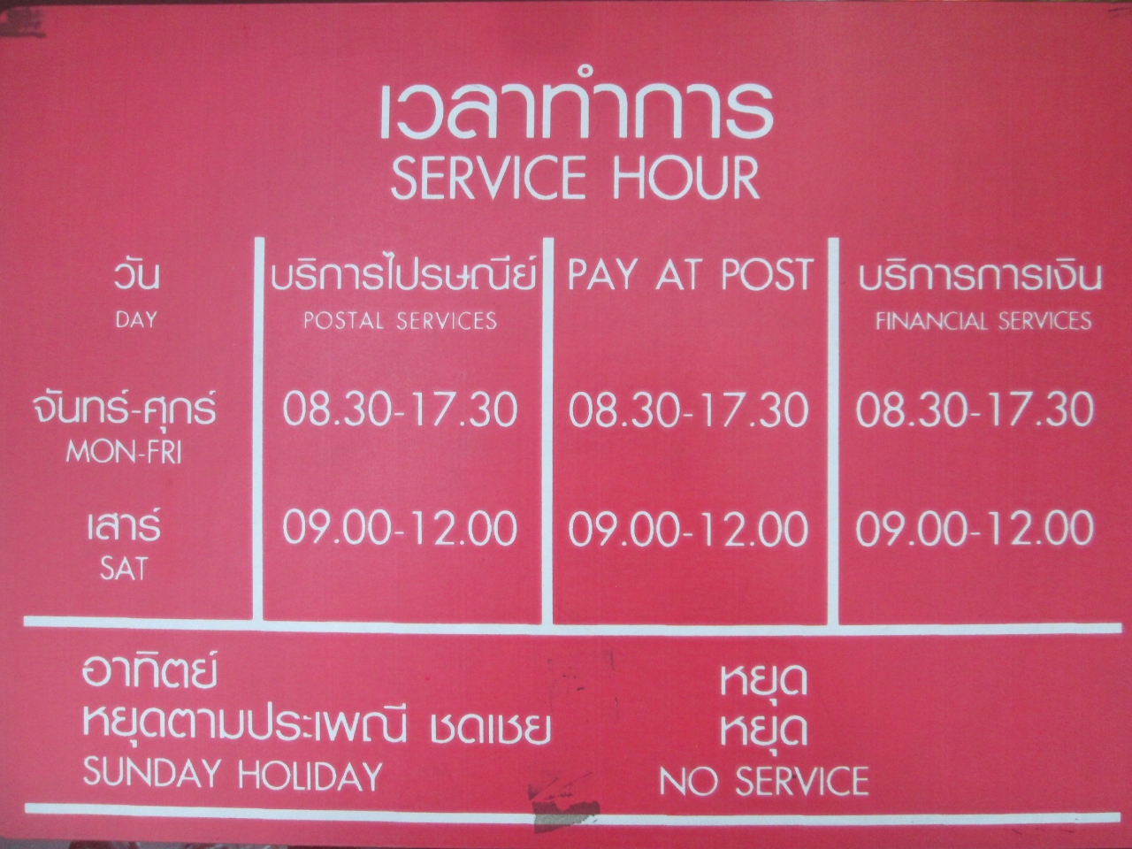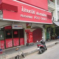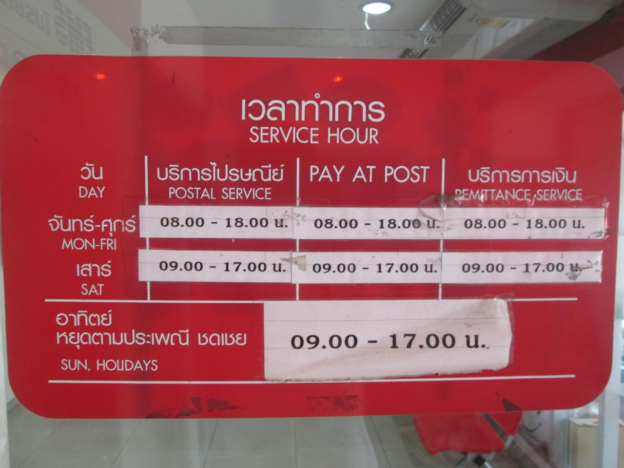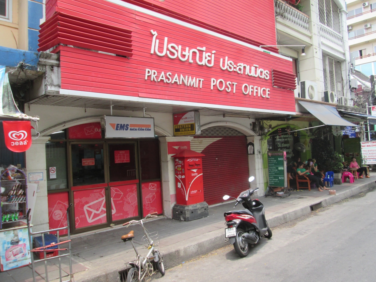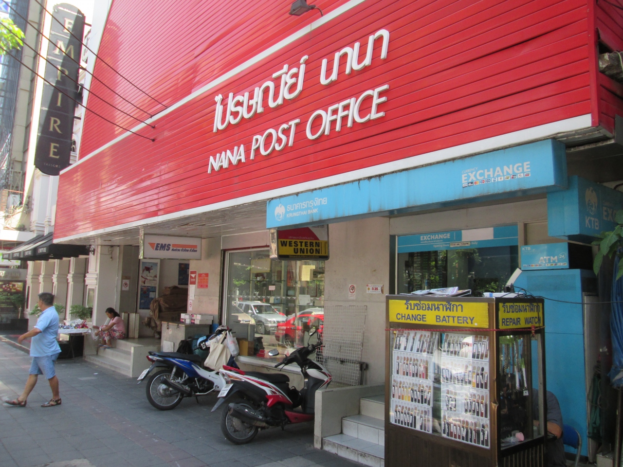 滞在3日目で月曜になったから郵便局へ出掛ける。プロンポン駅偶数側。ソイ24~26に向かうとある銀行裏手。通路と思えないところ、銀行の横を行く。きのう日曜でもやってるか確かめようと知ってる道を進んだら。銀行駐車場ガードマンらしいオジサンから怖い顔でピピピーッと笛をならされる。営業してないから行っちゃいけないらしい。月曜は怖い人が居ない。