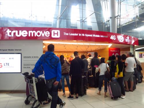 私が先にバンコク入りして、夫は後日バンコクに到着予定だったため、連絡が取りやすいように、スワンナプーム空港に到着した際、TRUE MOVEという電話会社のSIMカードを購入しました。3日間なので150バーツのにしようかと思ったのですが、それだとネットだけで通話はできないと言われたので、7日間299バーツのにしました。係りの女性に携帯電話を渡すと、サクサクとSIMカードを入れ替え設定してくれます。このあと、ネットでホテルの場所などを調べることができたので便利でした。
