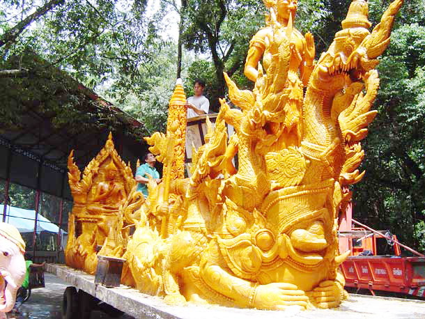 チェンマイでは花を利用してフラワーフェステバルが開かれたのを覚えている方もいらっしゃると思いますが・・これが今度はロウソクに変身するわけです・・どちらも鮮度が命ですが?・やはりロウソクの方が命は長いと思いきや??雨があればまだ良い物の?もしこれが天気だと??そのまま陽に当り続ケルト?柔らかくなり運が悪いと潰れてきたり解けてきたりして大変なことになるんだそうです・それにしても溶かされたロウソクの量は門凄いものがあると思います。今年のカオパンサーは7月20日から24日まで割と簡単な行事かな・と思いきや??