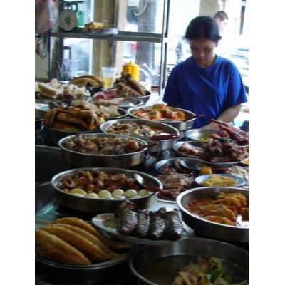 入り口におかずがずらりと並べられているので、おばちゃんを捕まえて、指で指して注文するとご飯付で席まで持ってきてくれます。どうやって注文主を覚えているのか不思議ですが、2階で座って待っていると運ばれてきました。