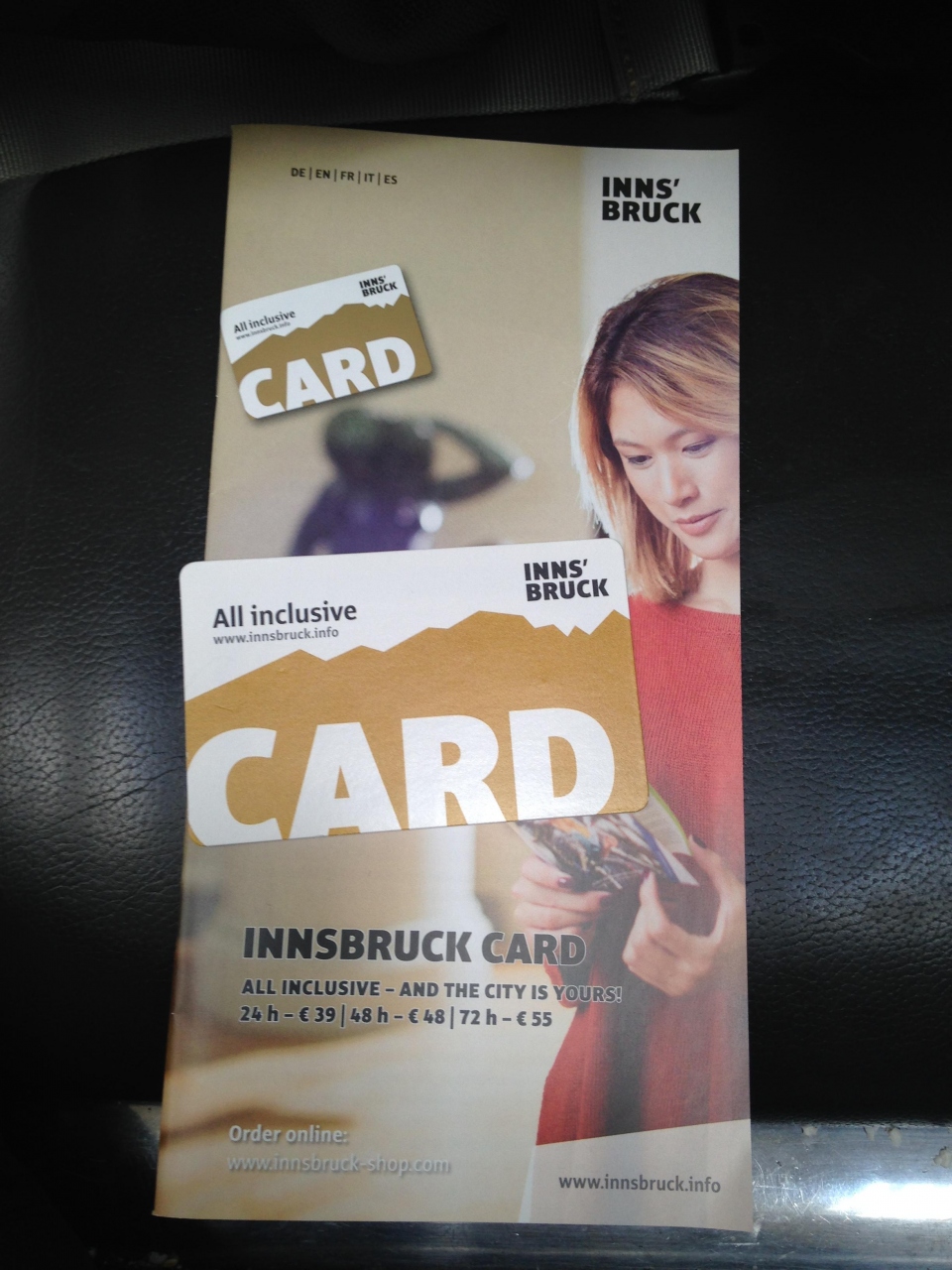 インスブルック空港の出口付近の売店で48時間(€48)で購入。空港から市内に行くバスから使用しました。日にち時間を自分で記入して使い始めます。このカードでハーフェレカーのロープウェイやパッチャーコーヘルへのバスやロープウエイやリフト、また各種観光地への入場料などに使い充分元はとれました。ロープウェイのる方は買って損のないカードだと思います