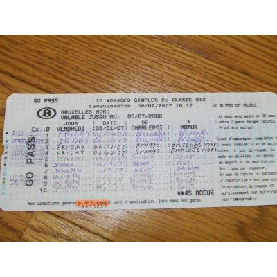 ベルギー国内のどの駅間でも使える片道10回分の回数券。