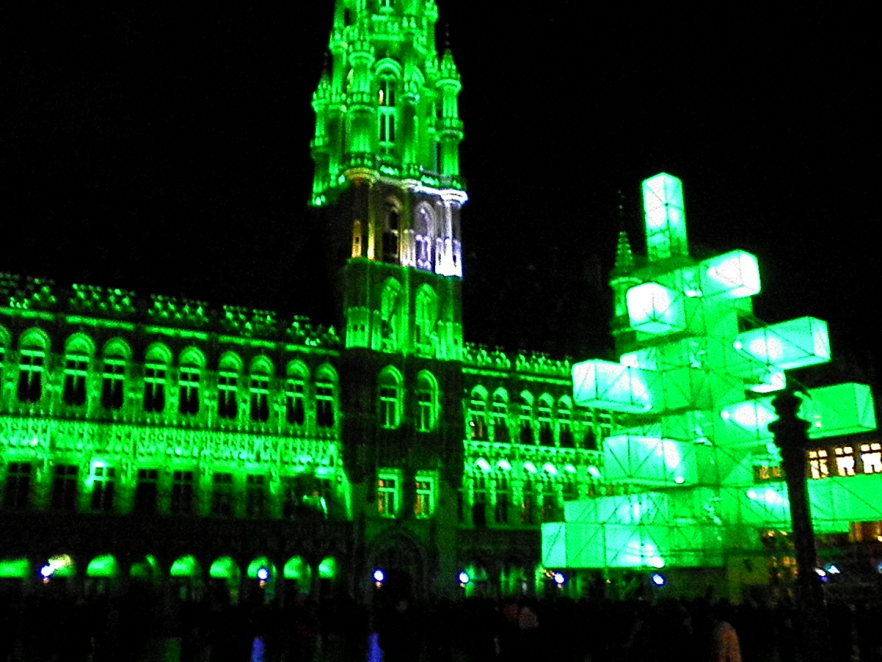 夜には、市庁舎とその周辺の建物に美しい光が当てられたレーザーショーが音楽と共に楽しめます。