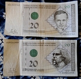 画像に出したのは、上がセルビア人共和国の20KM札、下がボスニア・ヘルツェゴヴィナ連邦の20KM札。肖像が違うほか、裏の文物の模様も違います。