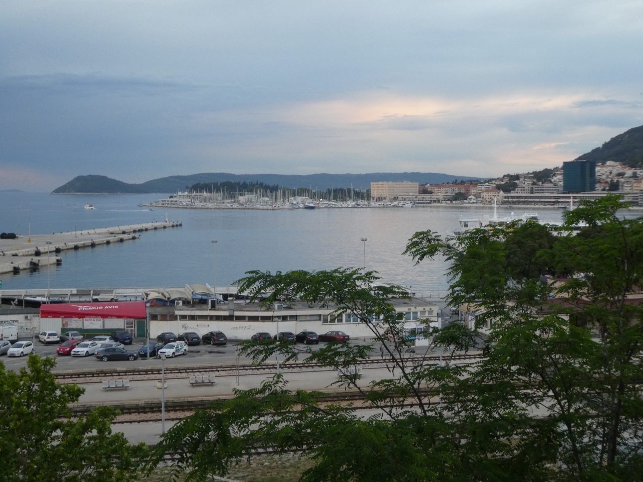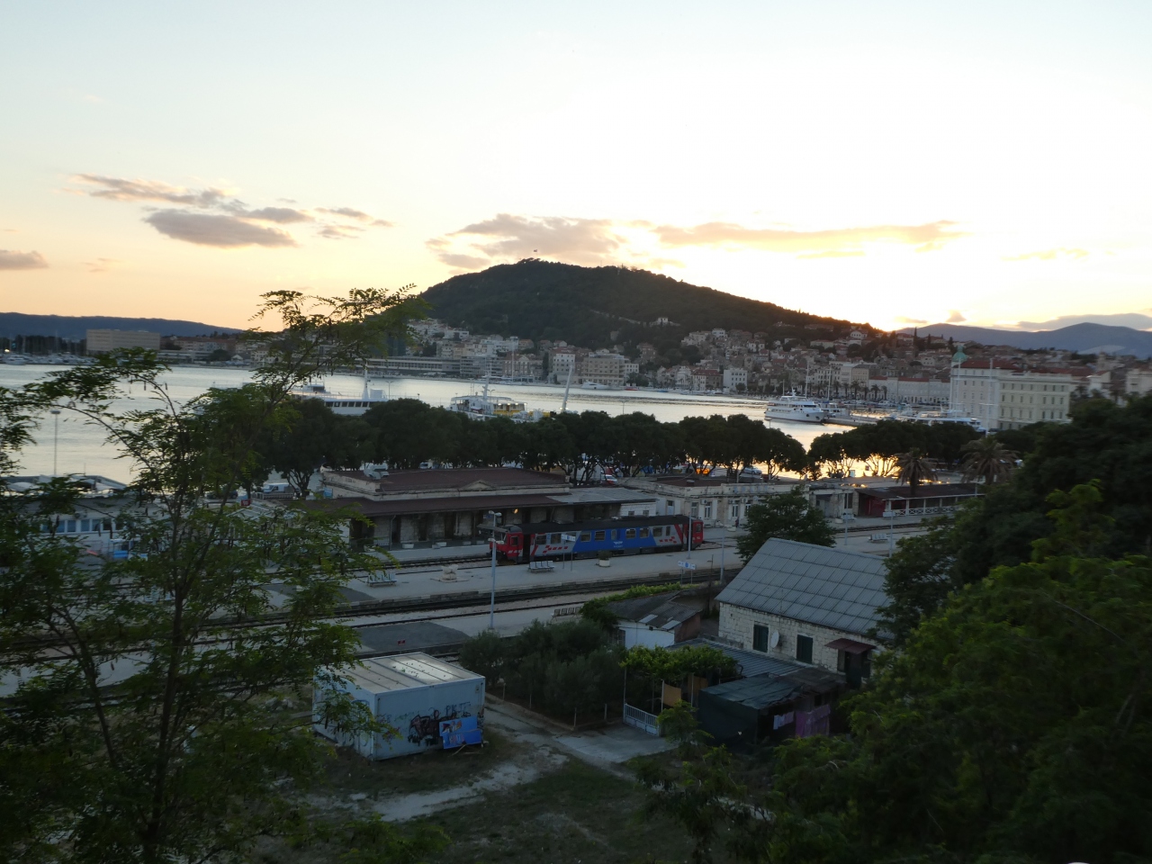ローマ皇帝ディオクレティアヌス帝が引退後に住んだ宮殿がそのまま旧市街になっていった珍しい期限を持つ街です。宮殿の南側は海になっており、その間の歩行者天国です。カフェが並んでいます。 ヤシの木の並木が有ったり南国のムードです。 城壁もライトアップされてました。 夜はステージで音楽を奏でていたり、蚤の市が開かれていたりすごく賑わっていました。