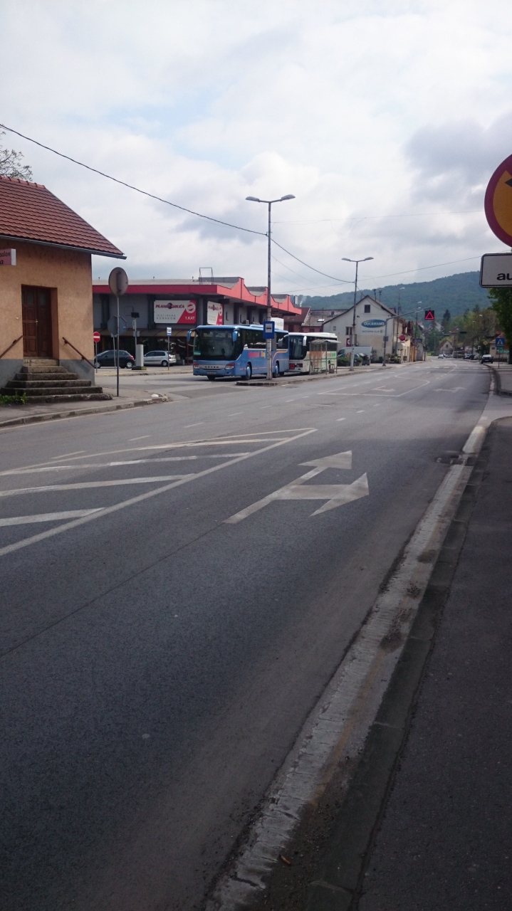 写真右側キオスク(売店)横の2本の木の間がプリトヴィツェ方面のバス停で、バスが止まっている右側の大通り側がスプリット方面からのザグレブ行きで、バスが停車している辺りがザグレブやプリトヴィツェ行きローカルバスのバス停になります。