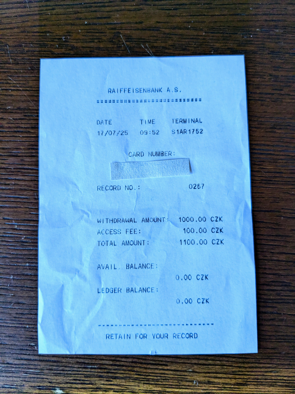 日本語以外のサイトからも手数料が少ない銀行の情報を集めてチェコでは「KB (Komercni Bank)」「RAIFFEISEN BANK」「AirBank」あたりがお勧めと当たりを付けておきました。AirBankのATMはブルノ本駅構内や街中で結構見かけましたが単体で設置されており、最悪クレジットカードが飲み込まれた場合怖いので避けました。KBは本駅周辺には見当たらず、駅からひとブロックぐらい北側にRAIFFEISEN BANKの建物がありその横の通り沿いにあるATMにてキャッシングをしました。"Without Conversion" の選択は出てきましたがそれ以外は問題なく 1,000CZK(200CZK x 5枚)を入手できました。レシートを見てショックだったのが "ACCESS FEE: 100CZK"の文字、「えー、手数料700円かよ!」と大分落ち込みました。スマホでカード会社の利用速報を見ると「7,936円」で約10%ぐらいの手数料と思われました。