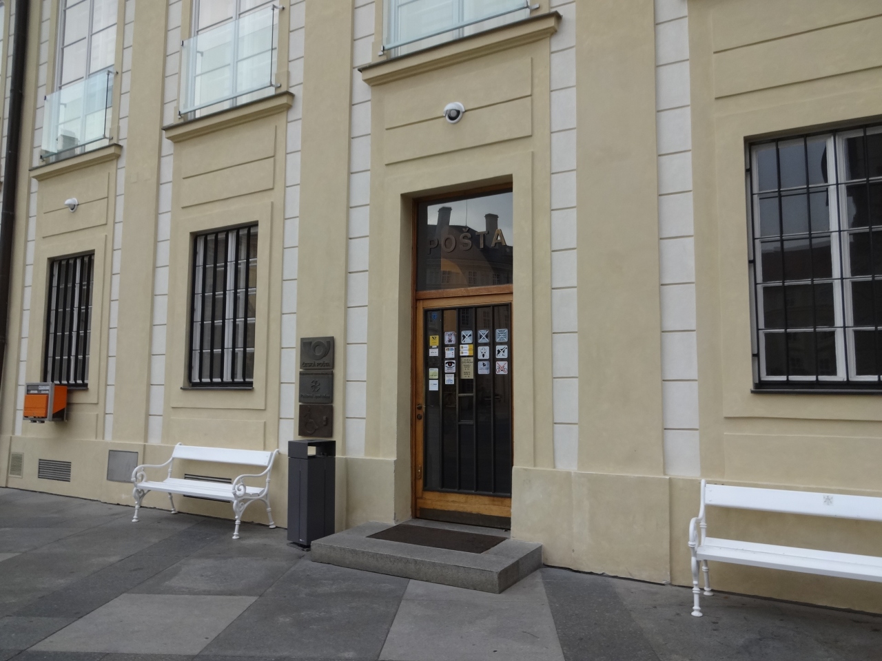 プラハ城の敷地内、聖ヴィート教会の斜向かいの辺りに郵便局があります。私が行ったのは月曜朝の8時過ぎでしたが、既に開いていました。