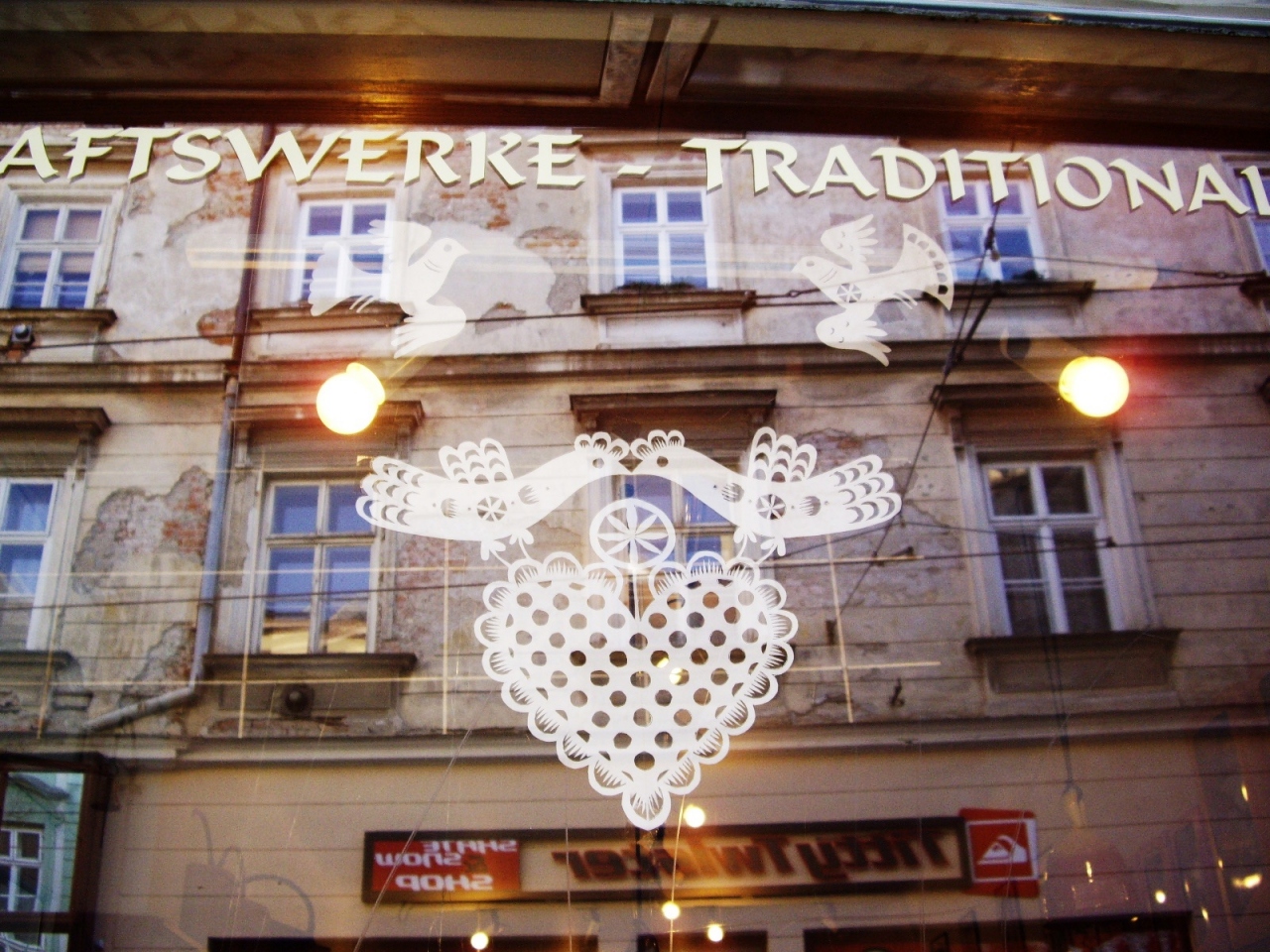 向かいの建物が映ってしまって見辛いですが、オロモウツで見かけたお店のウィンドーには、鳩とハートのかわいい紋切り型が飾ってありました。
