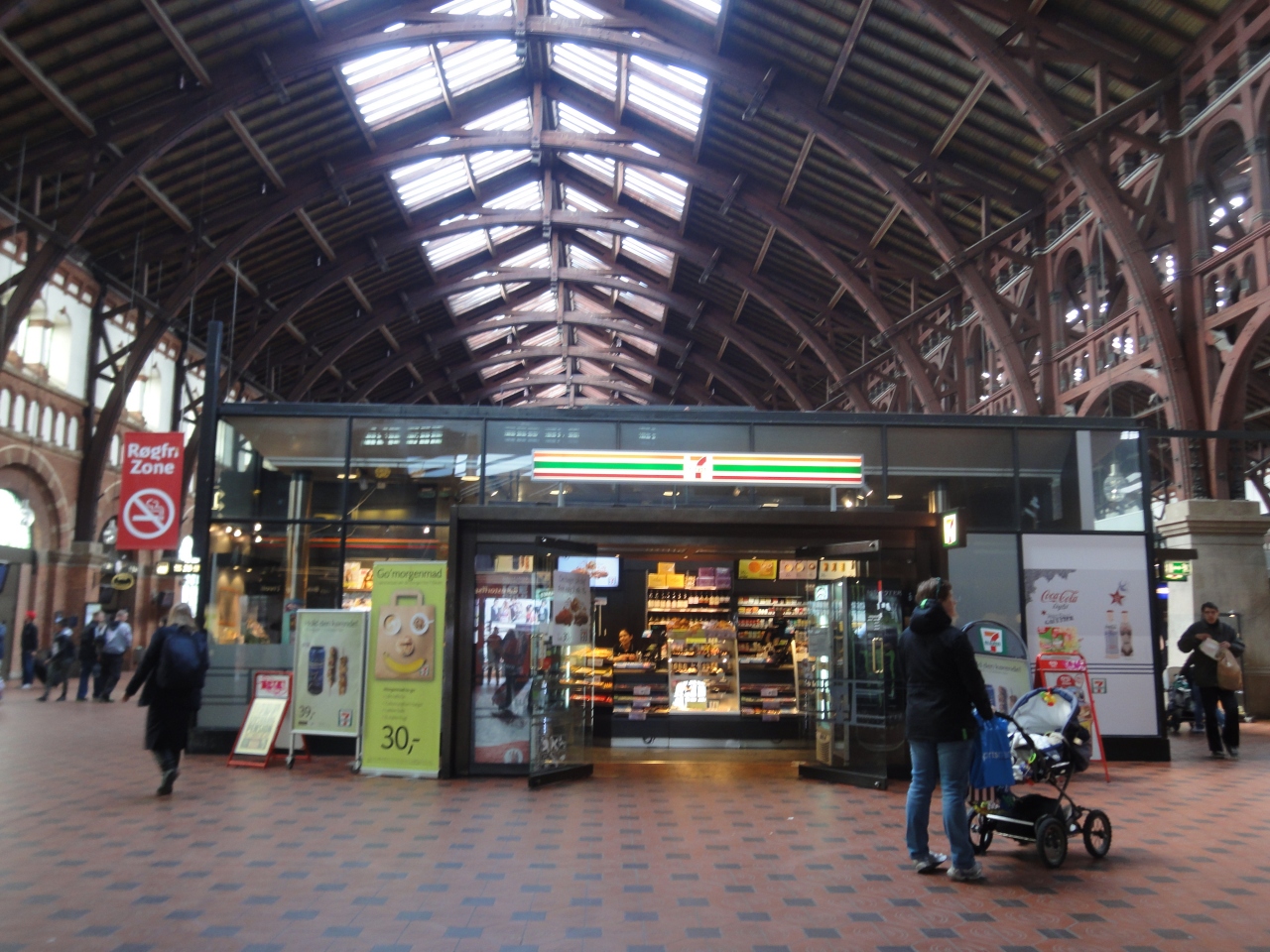 日本の汽車の駅にはキオスクがあるように、デンマークの汽車の駅にはセブンイレブンが入っています。 日本の品揃えとは異なり、飲料・スナック菓子がメインで花も売られています。 パンはケースに入っていて1個づつ選んで買います。