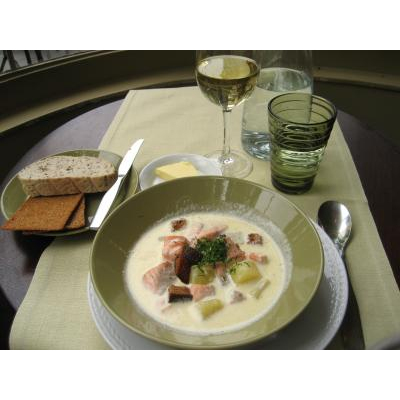 外は小雨こそやんでいましたが、気温が下がり寒かったので、伝統的なサーモンスープにしてもらいました。パンはサービス☆
