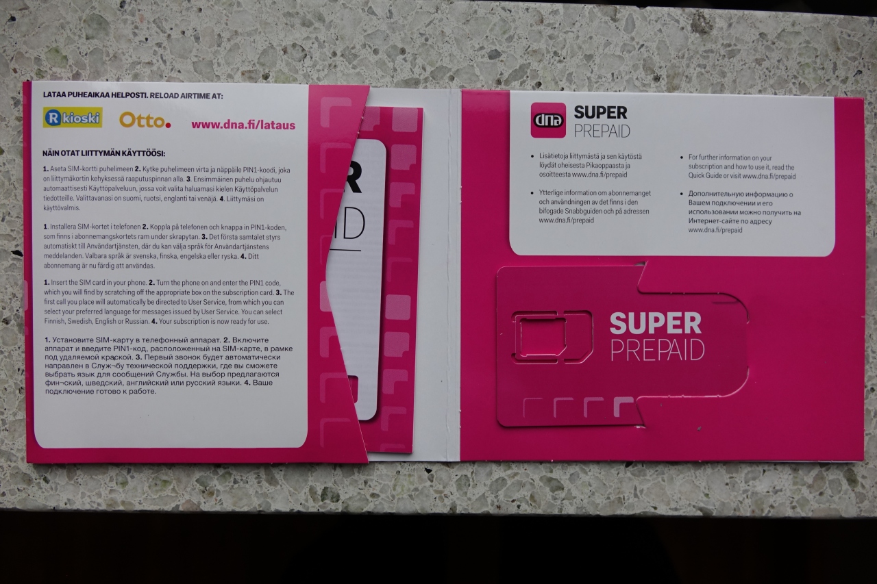 私は、ヘルシンキバンター空港の2階の出発ロビーにあるR-Kioskiでdna社プリペイドSIMの購入を購入しました。(中央駅等の他のR-Kioskiにもありました。)