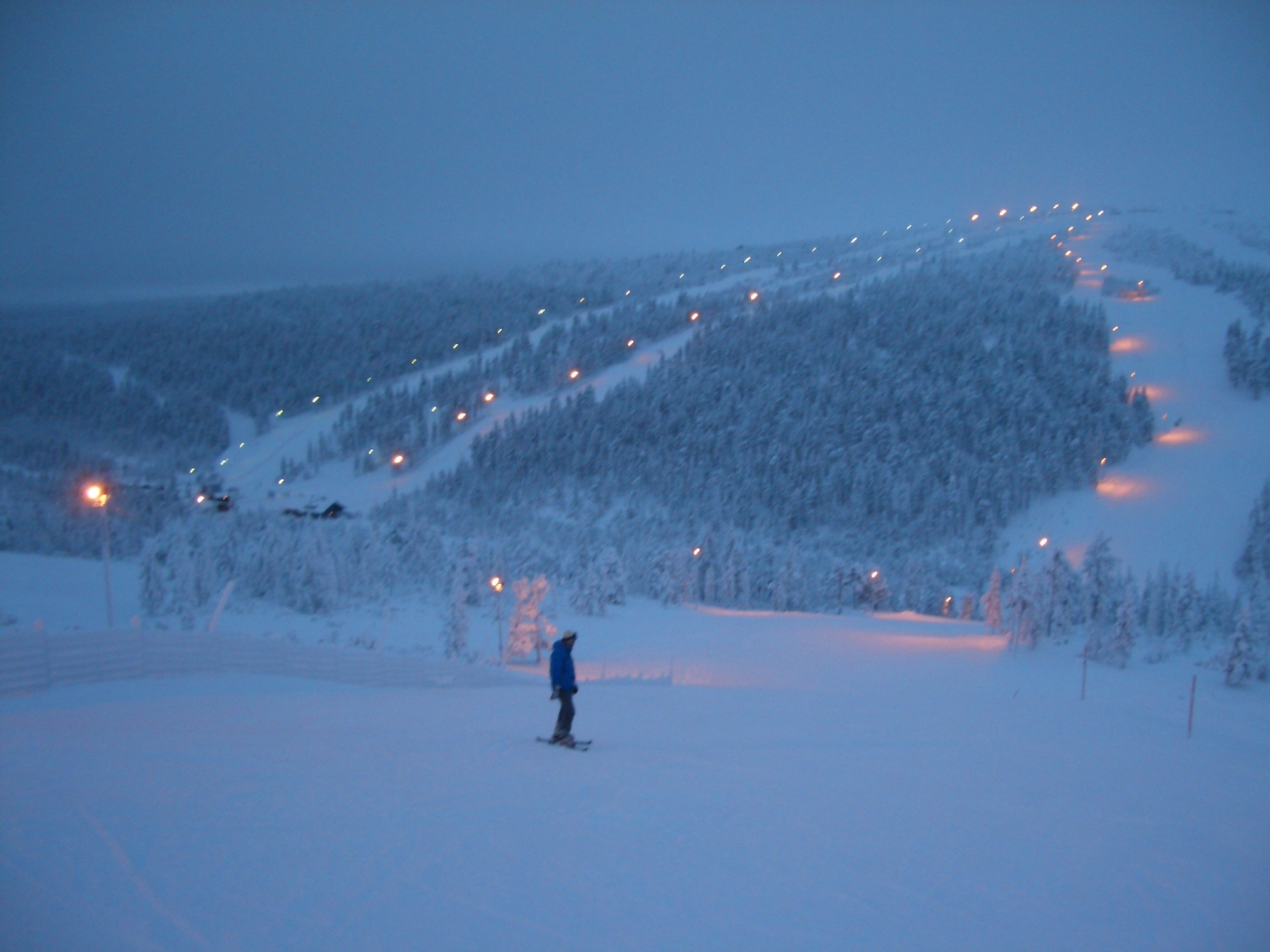 サーリセルカの中心部から巡回バスで5分程度、 歩いても10分ちょっとで辿り着けます。 スキーセンターでリフト券の購入とレンタルが出来ます。 2日券で54ユーロしました。 日本比べても高いですね。 初日は南側のゲレンデだけ、 二日目は北側のゲレンデもオープンしてました。 北側ゲレンデにはリフトやパークなんかもあり、 また山頂のレストランは雰囲気が良いのでオススメです。 南側のゲレンデはリフトではなくTバーなので、 最初は戸惑いますが、すぐに慣れます。 ゲレンデ斜度は上部ではなだらかでも 下部では日本の中級者コース程度にまでだんだん傾斜がきつくなります。 午後1時過ぎから暗くなりますがこの日没の景色がまた綺麗です。 ナイター設備がありますのでナイターも楽しいです。