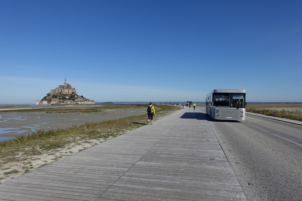 モンサンミシェルは海に面しているため、この時期は風が吹いていると寒いという情報だったので心配してましたが、当日は快晴で風もほとんどなく爽やかな気候でした。着ていた薄手のコートは、ドルドブルターニュからの連絡バスを降りて歩き始めた頃には、脱いでバッグにしまい長袖シャツで充分でした。