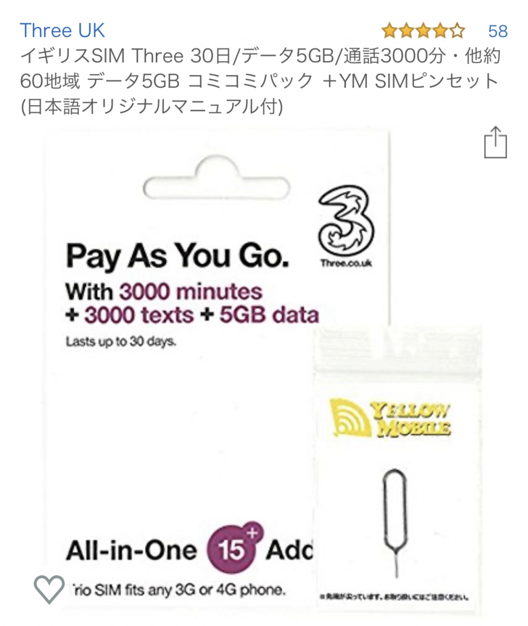 SIMフリーのiPhoneにAmazonで購入したThree UKのPay As You Go with3000minutes+3000texts+5GB dataを使用しました。