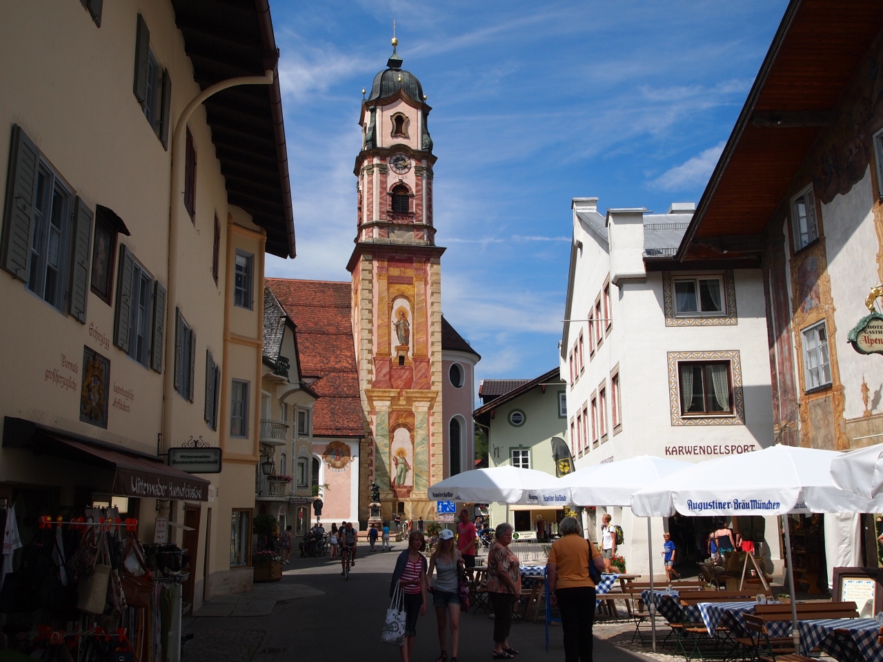 ミッテンヴァルトはスイス国境に近いバイエルン州の町です。 7月はさわやかな気候です。 陽射しは強いですが、日陰では湿度が低いので快適です。 服装は夏服でよく、半そで、半ズボンの人も見かけます。 カフェの店の前のテラス席では パラソルの下でみんなおいしくビールを飲んでいます。