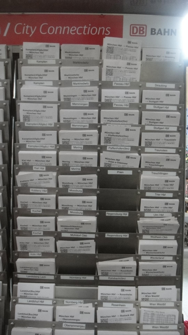 海外での鉄道の情報は切符を買う際に重要です。ミュンヘン中央駅には行先別の時刻表があります。目的地を選ぶとミュンヘンから目的地、目的地からミュンヘンの時刻表の情報が1枚の紙にのっています。通過する列車の情報は記載されていないので、安心して切符を買うことができます。