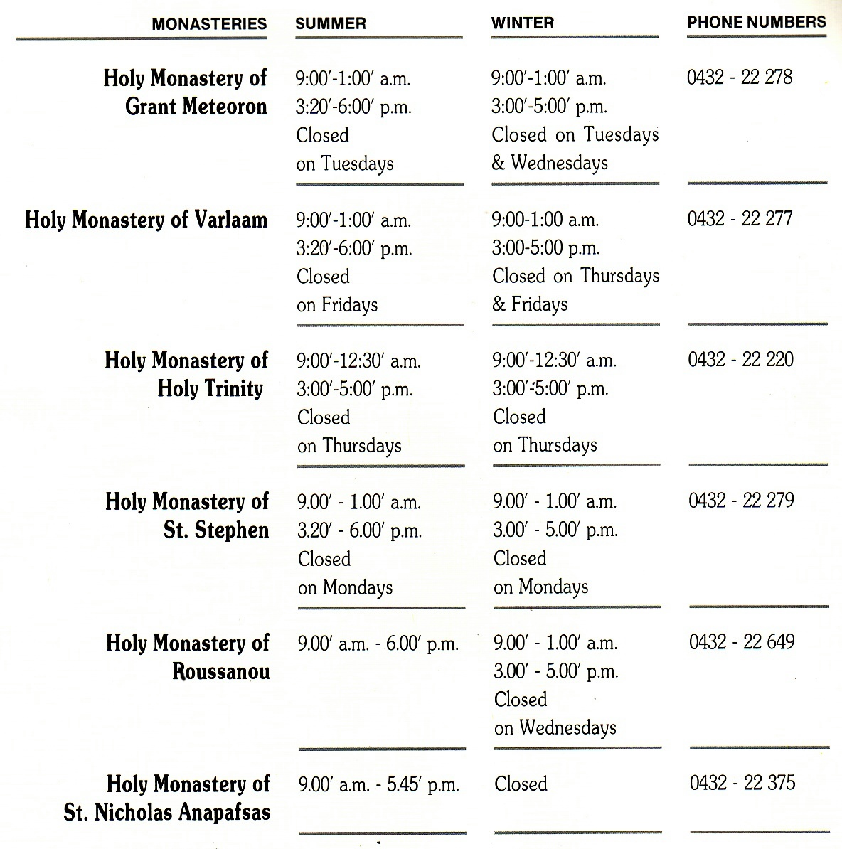 メテオラの一般に公開されている修道院では、公開がお休みになる曜日や見学時間がそれぞれ違っていたり、夏季・冬季によってもさらに違いが出てくるので、ご注意を。 下の画像は、いただいた資料に出ていた公開お休みの曜日と見学時間です。 私たちが行った12月初めはすでに冬季のプログラムになっていて、聖ニコラオス・アナパフサス修道院(Holy Monastery St. Nicholas Anapafsas)は閉鎖されていました。 この冬季というのは、聖ニコラオス・アナパフサス修道院前に出ていた看板によると12月〜3月のようなので、他の修道院もこれに準じているのかも。 この表では聖大メテオラ修道院の冬季のオープン時間が9時〜1時、3時〜5時になっていますが、私たちが行った07年の12月初めには変更になっていて、実際には9時〜4時でした。 今後の変更もありえるので、現地での確認も必要だと思います。 標識や資料に出てくる修道院の名称が、ギリシア語をアルファベットに置き換えただけの名と、英語に置き換えた名とあったりするので混乱しがち。スペルも資料によって異なるので戸惑う事があると思います。日本語に置き換えた修道院名も統一されていないようなのでご注意を。 私たちが実際に中まで見学したのは聖大メテオラ(Holy Monastery Grant Meteoron)修道院、ヴァルラーム修道院( Holy Monastery of Varlaam) 、アギア・トリアダ修道院(Holy Monastery of Holy Trinity)で、見学料はどこも2ユーロ。 奇岩の上に立つ修道院へは石造りの階段を上り下りしなければならないので、歩くための靴でどうぞ。 見学の際の服装については露出の多い服装はもちろんいけませんが、女性のズボンもだめと書いてあったのにはびっくり。でも、それぞれの修道院の入口付近には長いエプロン風の布が置いてあったので、私はズボンの上からそれを付けて入りました。 写真撮影不可の場所には標識が出ているので気をつけましょう。 下の資料画像に出ている修道院はどれも車道に近く、それぞれ駐車場もありました。 私たちはレンタカーで行きましたが、時間があれば、聖大メテオラ修道院(Holy Monastery Grant Meteoron)やヴァルラーム修道院( Holy Monastery of Varlaam) のあとは、徒歩でカストラキ地区へ車道を下りながらルサヌ修道院(Holy Monastery of Roussanou)や聖ニコラオス・アナパフサス修道院(Holy Monastery St. Nicholas Anapafsas)にも寄りたいと思った眺めのいい道筋です。 アギア・トリアダ修道院(Holy Monastery of Holy Trinity)と聖ステファノス修道院(Holy Monastery of St. Stephen)は、上記4ヶ所の修道院のある道筋とは別の道沿いにあるので、事前に地図とオープンする曜日・時間をよく見て、回る順番にご注意を。 なお、アギア・トリアダ修道院(Holy Monastery of Holy Trinity)へ徒歩で向かう坂からカランパカ地区へ下りて行く脇道があるので、徒歩で町へ降りていこうと思っている方はお見逃し無く。