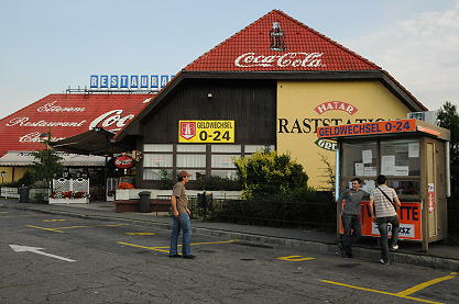 ウィーンから高速道路A4号線(E60号線)で、オーストリアとハンガリーの国境を越えると、画像右側のようにドイツ語でGELDWECHSEL(両替)と出ているブースがあります。