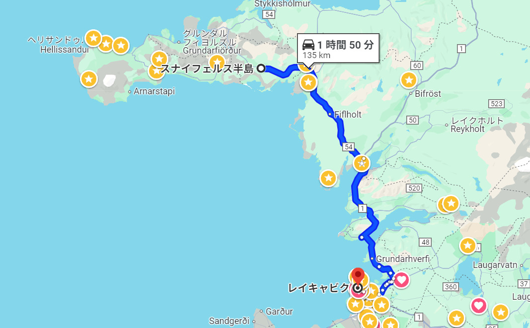 レイキャビクから1号線の道路を進む。ボルガルネース(Borgarnes)を超えたあと54番道路に進んでいくとスナイフェルスネース半島に入る。