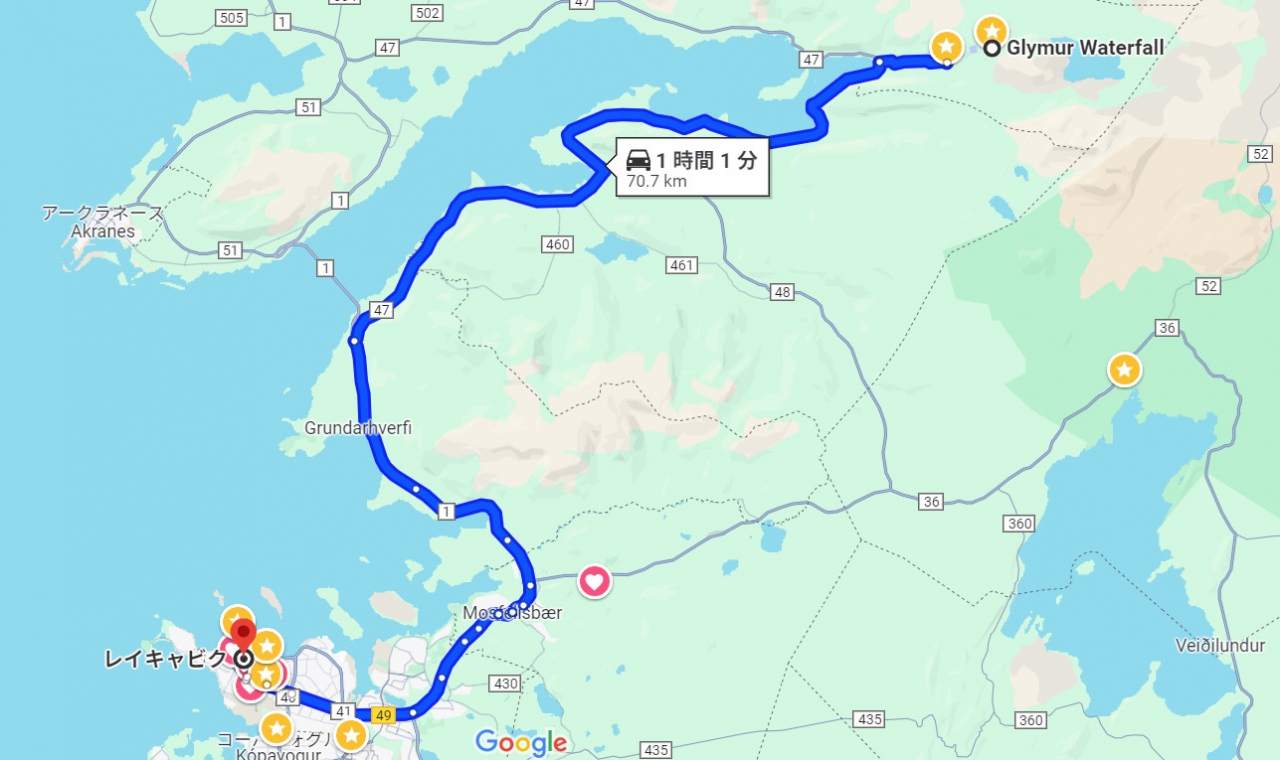 レイキャビクから1号線を通り、アークラネス(Akranes)方面へ向かいます。途中で47号線が出てくるので右折。そのままグリムールの滝の入口まで運転。