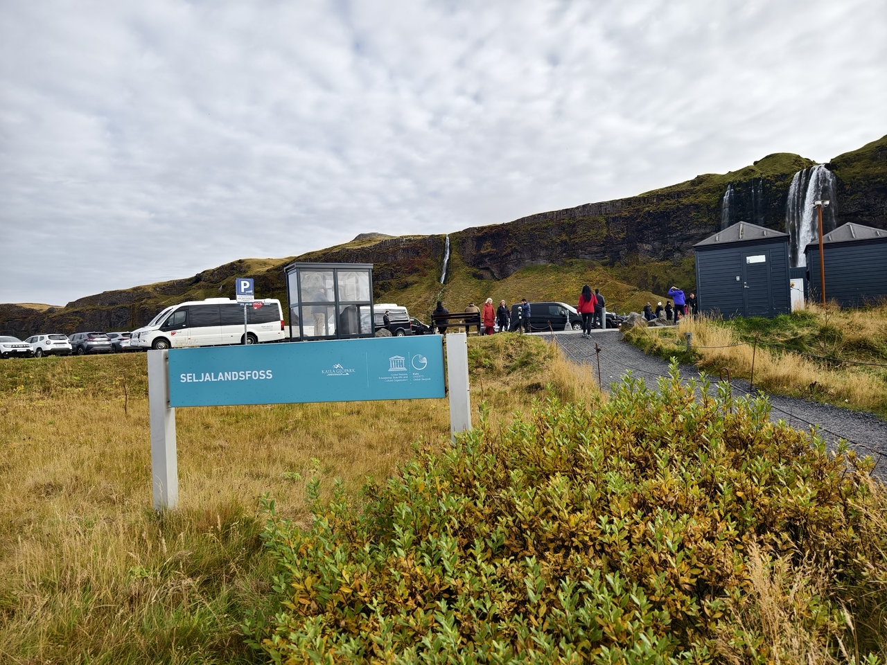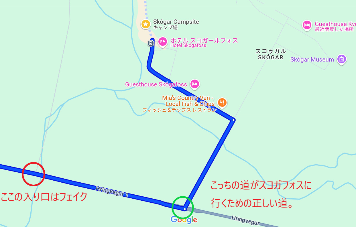 レイキャビクから1号線の道路を進みます。Hvolsvöllur(クヴォルスヴォルール)を越えてからおおよそ50kmほど。セリャラントスフォス行く場合はおおよそ30kmほど。運転中に大きなスコガフォスが見えてくるので迷わないはずです。
