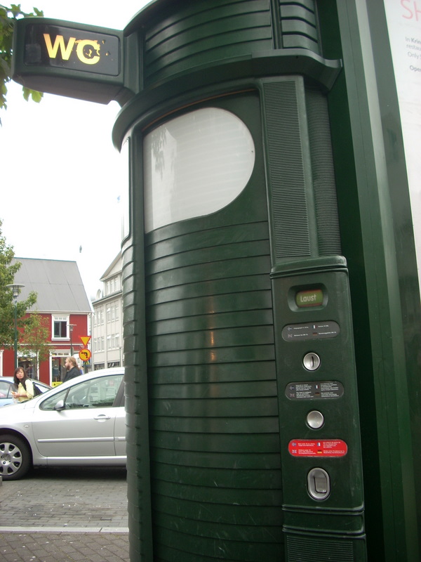 レイキャビクの街中を歩いていると、突如現れる筒状の電話ボックスのような物。よくよく見るとWCと書いてあり、コイン式のトイレでした。散歩中に何度か見かけたので結構はいちされているようです。ヨーロッパでは時々見かける街中のコイントイレですが、慣れていないとちょっと使うのに敷居が高い気がします。そんなに綺麗という感じでも無いです。