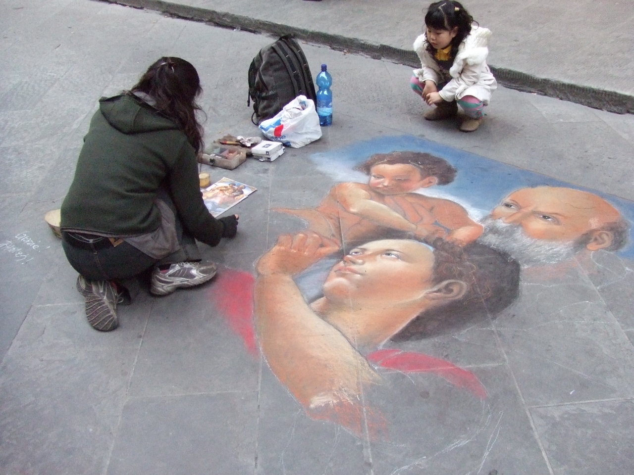 道路に4人の人が絵画のコピーを見ながら描いていました。