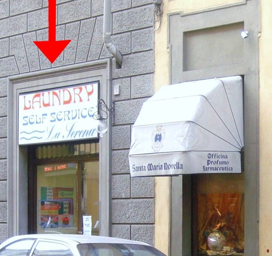 写真右手前黄色の壁に白いシェードがサンタマリアノヴェッラ薬局の端っこ、その隣の石の壁に赤い矢印がセルフランドリー屋さんです。わかりやすいでしょう?