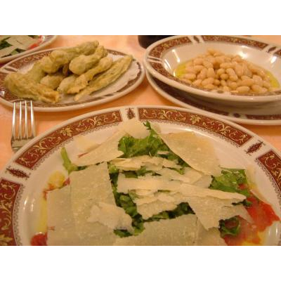 *マンマ・ジーナ*トスカーナの地元家庭料理を頂ける老舗のお店。地元・観光客にも人気があるトラットリアで写真は牛肉のカルパッチョ、アンティーヴのフライ、そして大好きな素朴な料理、白いんげん豆の煮物。店員のおじさんtたちはとってもユーモアのあるつっこみ役。例えば・・デザート注文に、何がいいか迷っていたら、“わかった、君の為のスペシャルデザートを用意するから、おいで!”と沢山のデザートの乗るワゴンまで手をとり連れて行かれ“なに?全部食べたいだって?!ok OK!”って←まだ何も頼んでないっつうの!その後の、コーヒーには“砂糖は必要?”ときいておきながら、いざ蓋を明けてみると←“こりゃ、お塩じゃないのおぉ!(p_-)。とっても楽しかったけど、他のテーブルのお客さんには、かなり笑われるし、ワインはきいてくるし、二重でお顔がまっか☆