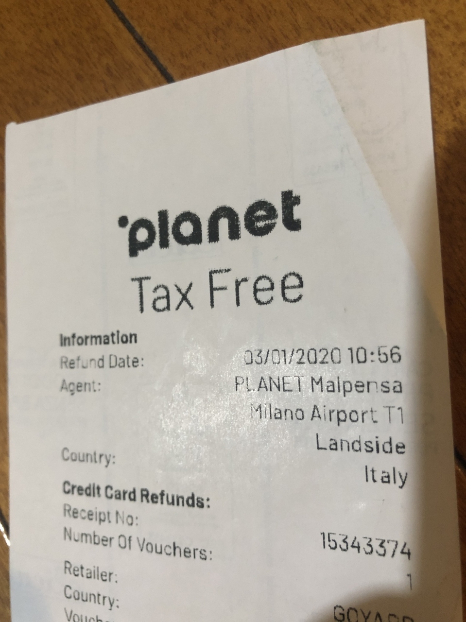 今回はPlanet(プレミアムタックス旧会社名)の免税でした。グローバルブルーも横にありました。かなり混んでましたね!ミラノのアウトレットで買うと引き受け会社がグローバルブルーなんです。