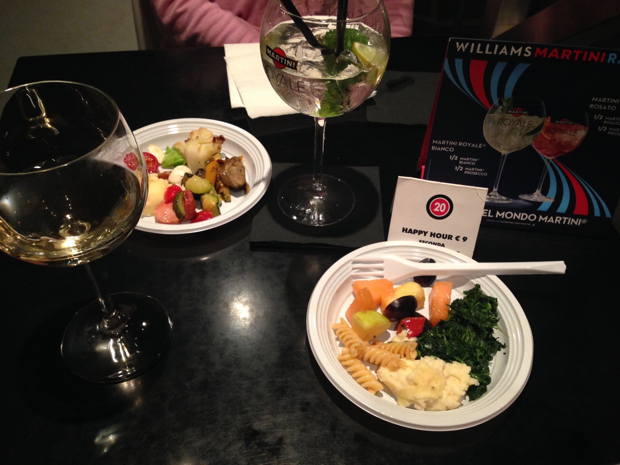 ミラノのレストランやバルには、1杯のドリンク料金でビュッフェスタイルの料理が食べ放題になる「ハッピーアワーHappy Hour」というシステムがあります。※「アペリティーボaperitivo」(食前酒)を、ハッピーアワーの同義語としても使っているようです。