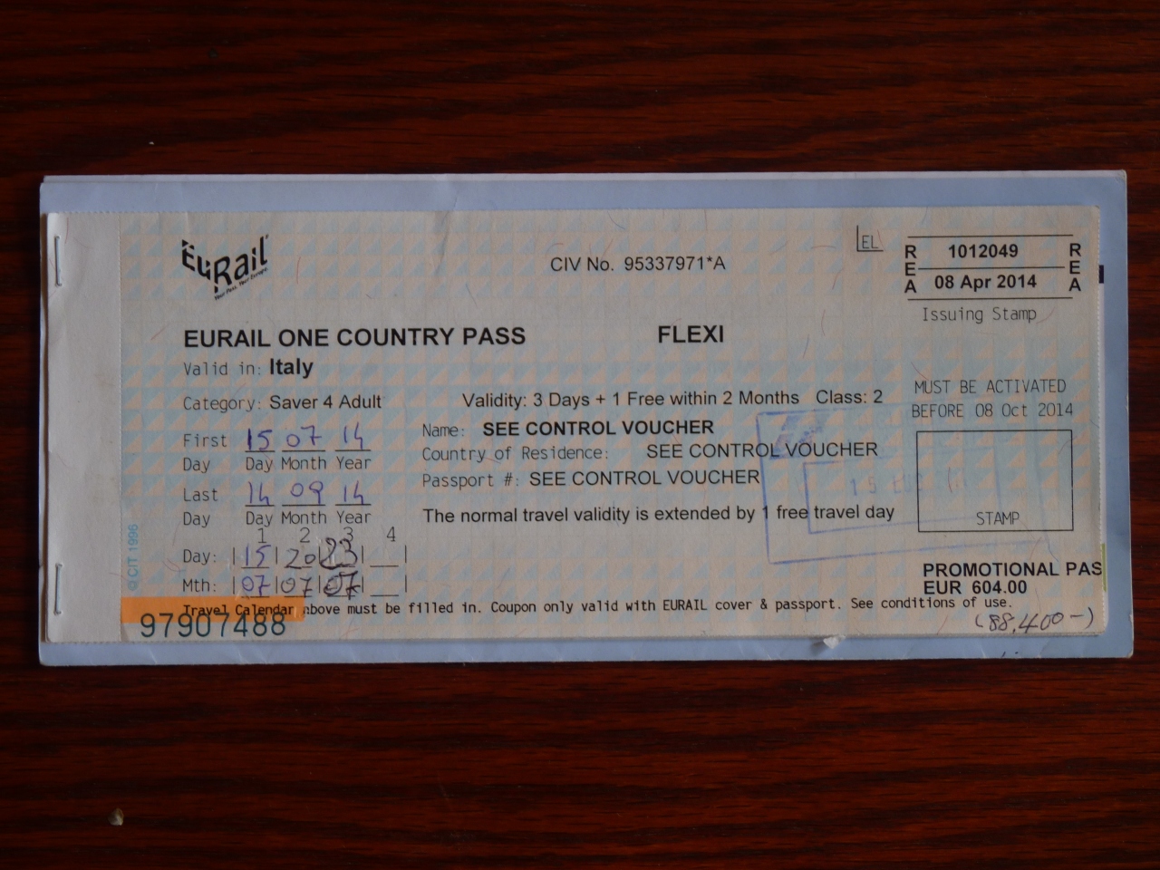 イタリア国鉄に乗り放題のパスで1等と2等があるがこんかいは2等を使用した。日本で購入可能でトレインイタリアパスの3日間で22100円であった。利用開始から2ケ月間有功なので便利が良い。特に主要都市(ミラノ等)の駅での切符買いは長蛇の列で買わねばならないので助かった。