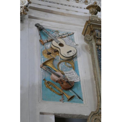 ラッパ、バイオリン、ギターなど、オーケストラに登場する全てが飾られています。