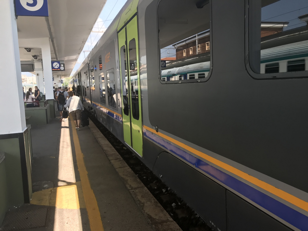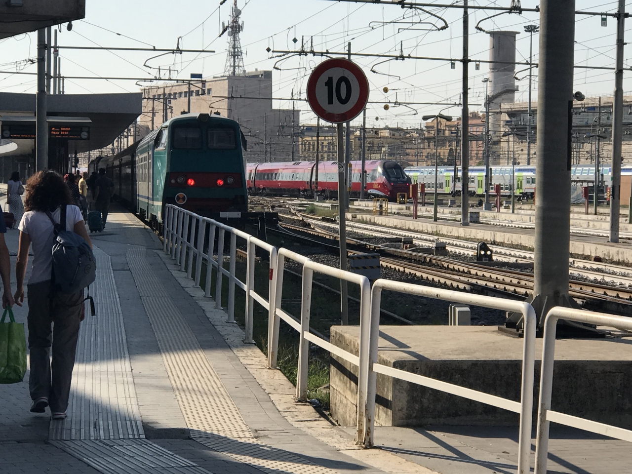 ローマ・テルミニ駅9:30のアンコーナ行き列車でアッシジに向かいます。この列車を使う場合、途中フォリーニョで乗換になります。 まず、テルミニ駅。券売機は駅の至る所にあるので、迷うことはないと思います。英語を選ぶことができます。クレジットカードが使えます。乗る列車を指定するように指示されますが、きっぷに列車名が書かれることはありません。€10.75です。 さて、切符を買うと、ホームに向かいますが、2est番線。これは、1番線の横からさらにずっと歩いて行った先になります。相当歩きます。時間には余裕を見た方がいいと思います。打刻を忘れずに。 4両編成なんですが、前2両に1等車の表示が見えます。でも実は一番前は2等車です。 トイレは、前3両の前部にあります。まともなのは一番前の車両の前のトイレだけでしたが。 平日でしたが、夏だからでしょうか、混んでいました。10分前に乗り込んだ私達はなんとかバラバラに座ることができましたが、それより後に乗ってきた方々は結局フォリーニョまで座席がありませんでした。 携帯は、ほぼ全線に亘って使えました。トンネル内は、使えるところと使えないところがありました。 フォリーニョの乗換。地下道を通って、5番線テロントラ行きに乗り換えます。駅のトイレは1番線の方にありましたが、有料です。 フォリーニョからの列車は最新型らしいJazzという列車。日本での低床バスのような、ドア近くと車輪の上とで段差のある床。こちらのトイレは円形ドアで、快適に使えました。 さて、アッシジの駅で、アッシジ市内までのコミュニティーバス往復と、帰りのローマまでの列車チケットを買います。(ローマで列車の往復を買うこともできます) 駅の入り口を出て少し左に行った売店で切符を売っていますから、ここで買います。現金のみです。バスは、車内で買うこともできるみたいです。